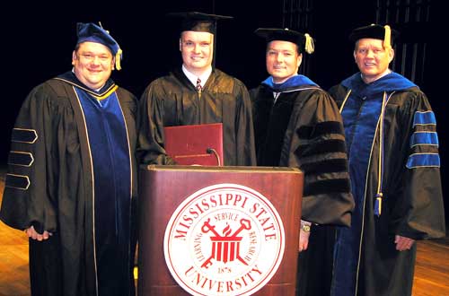 Gary Wayne Pace of Bailey (2nd from left) made history during Friday's Mississippi State University-Meridian commencement ceremonies when he became the first graduate to earn a degree from MSU-Meridian's newest degree program--bachelor of business administration with a concentration in healthcare administration. Pictured are (L to R): Dr. Carlton Young, assistant professor of healthcare administration; Gary Wayne Pace; MSU President Mark E. Keenum; and Dr. Jack Tucci, dean and executive director of MSU-Meridian.