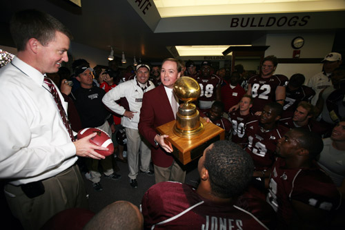 President Keenum celebrates the Egg Bowl 2009 victory with athletic director Greg Byrne, head football coach Dan Mullen, and the winning Bulldog football team.