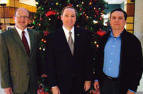 President Keenum lit the Libraries' Christmas tree on Nov. 2. Libraries' Administrator of Systems Stephen Cunetto (right) welcomed Dr. Keenum and guests and served as master of ceremonies. Students, staff, and faculty visited while carols by MSU's Chamber Choir, led by Dr. Bruce Lesley (left), filled the library.