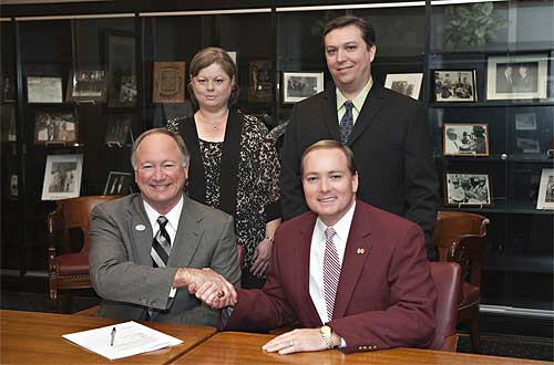Presidents Rick Young of EMCC (l) and Mark Keenum recently marked the formal participation of the community college in the Golden Triangle Regional Library Consortium. EMCC's Donna Ballard and MSU's Stephen Cunetto, library staff members at the respective institutions, also were part of the program.