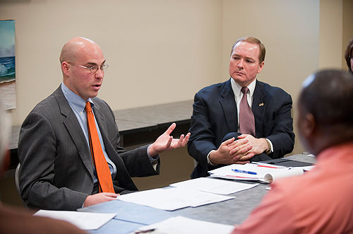 Starkville Mayor Parker Wiseman (l) and Mississippi State President Mark Keenum were among municipal, university and Oktibbeha County officials who gathered recently at the Starkville Sportsplex to discuss cooperative short-term priorities and long-term visions.