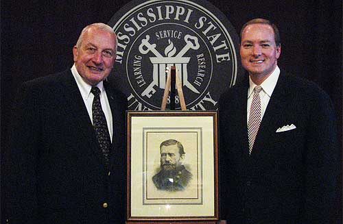 U.S. Grant Association President and Rhode Island Chief Justice Frank J. Williams (left) poses with Mississippi State President Mark E. Keenum and a portrait of Grant during the association's annual--and first--meeting at the university. Mitchell Memorial Library recently was named the new home of the presidential papers of Ulysses S. Grant, America's 18th president. (Photo by Jim Tomlinson)