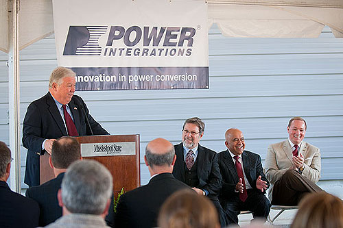 Mississippi Gov. Haley Barbour (standing) was among dignitaries participating in a Friday announcement that California-based Power Integrations would invest $30 million in SemiSouth, a silicon carbide semiconductor industry that was spun off from Mississippi State University research.