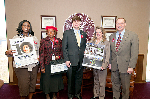 Mississippi State University has joined as a partner with the U.S. Census Bureau to highlight the importance of a producing an accurate count on Census Day, April 1. Pictured are Audrey Swanigan of Columbus, Census Partnership Assistant; Mattie Richardson Fox of Tupelo, Census Partnership Specialist, MSU Student Association President Thomas Sellers, Dr. Bethany Stich, chair of the MSU Subcommittee of the Oktibbeha County Complete Count Committee and MSU President Dr. Mark Keenum.