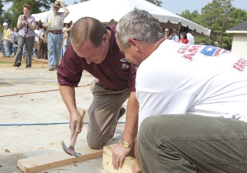 President Keenum lends a hammer and a hand to help construct the 2010 Maroon Edition Habitat House. The Starkville home is being built as a university-wide service activity in conjunction with the book Three Cups of Tea.