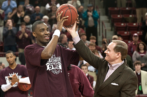 President Keenum presented forward Jarvis Varnado with a game ball in a post-game celebration at Humphrey Colliseum on Wednesday, Feb. 24, 2010. Varnado surpassed the NCAA shot block record in a game against Alabama.