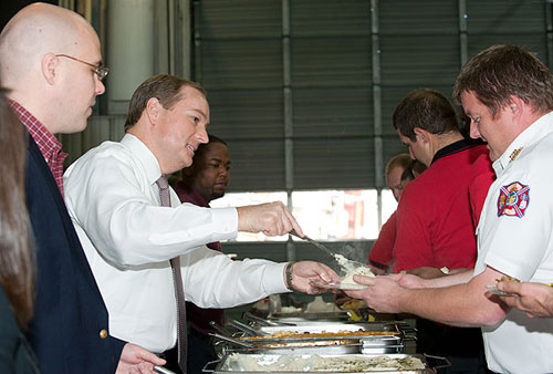 President Keenum serves Thanksgiving lunch to Starkville firefighters. President Keenum serves Thanksgiving lunch to Starkville firefighters.
