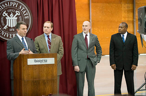 President Keenun represented MSU at a gathering of local leaders who announced a collaboration to seek funding to develop Starkville's Bryan Field airport to attract aerospace industries. Seen here are (l-r) Greater Starkville Development Partnership President Jon Maynard, Keenum, Starkville Mayor Parker Wiseman and Oktibbeha County Board of Supervisors President Marvell Howard.