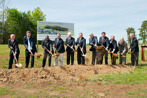 City, county and university officials came together Monday with Mississippi congressional leaders to break ground and celebrate a new business incubator, which will also accommodate expansion of II-VI Inc., a growing company already housed at the Thad Cochran Research, Technology and Economic Development Park. Participating in the groundbreaking were David Shaw, vice president for research and economic development; Whit Hughes, Mississippi Development Authority; Marvell Howard, Oktibbeha County Board of Supervisors; Jack Wallace, Oktibbeha County Economic Development Authority; Senator Thad Cochran; MSU President Mark Keenum; Congressman Alan Nunnelee; Congressman Gregg Harper; Carl Johnson, II-VI Inc. Board Chairman; Starkville Mayor Parker Wiseman; and Architect Jim Eley.