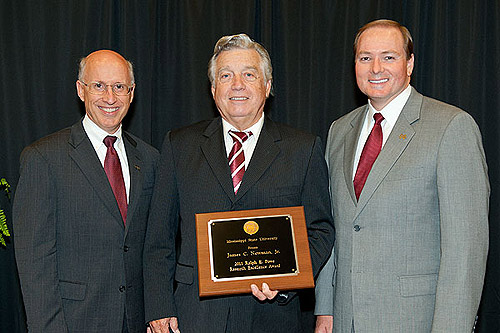 Dr. Keenum and Dr. David Shaw recognize aerospace engineering professor Dr. James Newman (center) with the Ralph E. Powe Research Excellence Award.