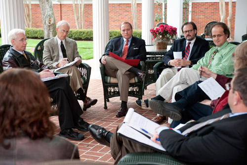 Dr. Keenum meets with members of the Faculty Senate at his campus residence. Dr. Keenum meets with members of the Faculty Senate at his campus residence.