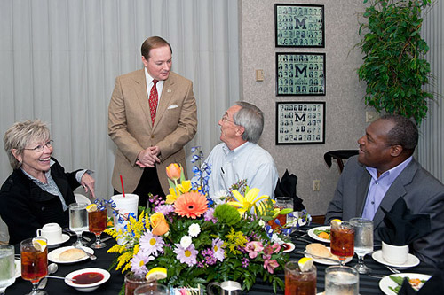 MSU President Mark E. Keenum visits with Oktibbeha County administrator Don Posey, while Lynn Spruill, Starkville's chief administrative officer, and Marvell Howard, a member of the Oktibbeha County Board of Supervisors, look on. Community leaders visited at Mississippi State's Leo W. Seal M-Club Center Friday for lunch and discussion of general issues to help enhance the relationship between the university and community. This meeting was part of a series of gatherings for the group of leaders.