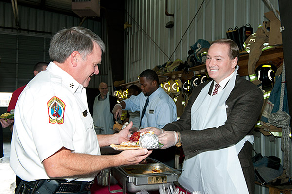 MSU President Mark Keenum serves food to Starkville Fire Chief Rodger Mann at the Lampkin Street Fire Station.