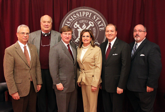 Tate Reeves, third from left, who is in his second term as Mississippi's state treasurer and is Lt. Gov.-elect, was welcomed to the MSU Starkville campus on Nov. 29. Greeting him were, from left, Jerry Gilbert, provost and executive vice president; Marty Wiseman, director of the Stennis Institute of Government; Amy Tuck, executive director of campus operations; Mark E. Keenum, MSU president; and Sid Salter, journalist-in-residence.