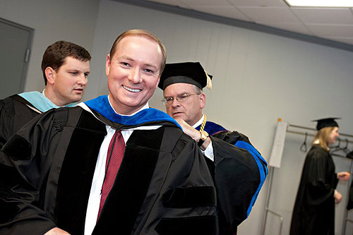 Vice Presidents John Rush and Bill Kibler assist President Keenum with his graduation regalia. Vice Presidents John Rush and Bill Kibler assist President Keenum with his graduation regalia.