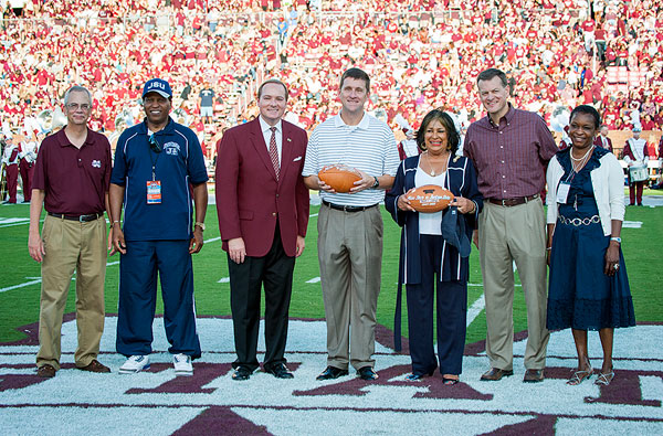 Dr. Keenum and Scott Stricklin present footballs to Hank Bounds, Mississippi Commissioner of Higher Education, and Carolyn Meyers, Jackson State University president at halftime of the MSU/JSU football game.