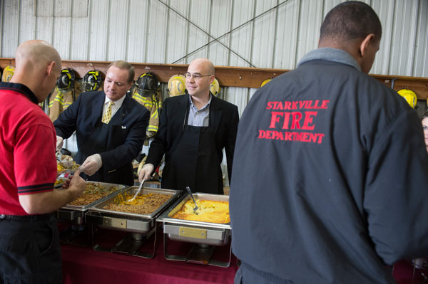Dr. Keenum and Starkville mayor Parker Wiseman serve a Christmas lunch to local firefighters to thank them for their service to the community.