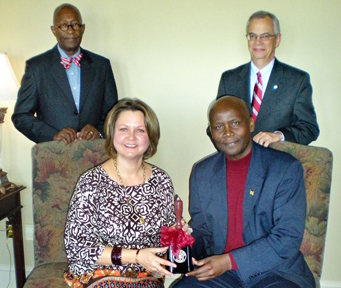 Mississippi State University First Lady Rhonda Keenum, seated left, presented His Excellency Elkanah Odembo, the Kenyan Ambassador to the U.S., seated right, with a commemorative MSU cowbell following a luncheon in Odembo's honor on Thursday in the Swalm Chemical Engineering Building Suite. Shown with Ambassador Odembo were K.C. Morrison, head of the Department of Political Science and Public Administration and MSU's senior fellow in African Studies, standing left, and MSU Provost Jerry Gilbert, standing right. Odembo personally knew fellow Kenya-native Wangari Maathai, the late author of "Unbowed" who wrote the memoir selected by university leaders as the 2012 Maroon Edition. To learn more about Odembo's visit or MSU's Maroon Edition, visit http://www.maroonedition.msstate.edu.