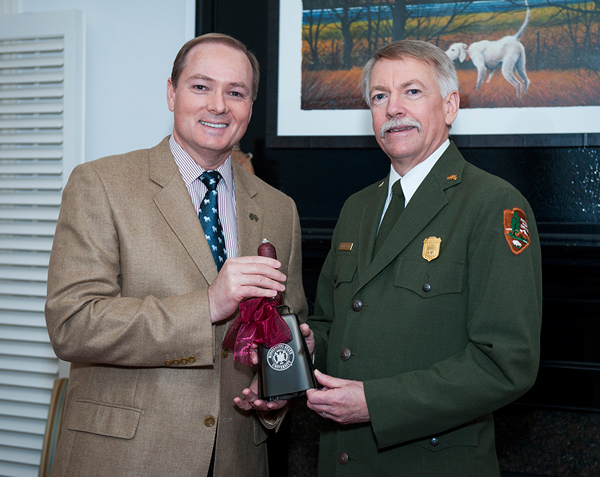 MSU President Mark E. Keenum presents a cowbell to National Park Service Director Jon Jarvis during his visit to campus.
