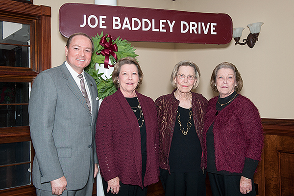 During the Tuesday rededication ceremony for Joe Baddley Drive at the adjacent A.B. McKay Food Research and Enology Laboratory, President Mark E. Keenum presented former signage marking the road to members of the Baddley family. They include (l-r) Jean Baddley Cox, Connie Baddley, and Joan Baddley Ishee.