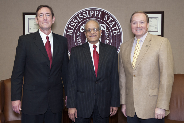 Former Mississippi State faculty member Sonny Ramaswamy, center, now a senior U.S. Department of Agriculture administrator, visits with Greg Bohach, MSU vice president for the Division of Agriculture, Forestry, and Veterinary Medicine, left, and MSU Pres