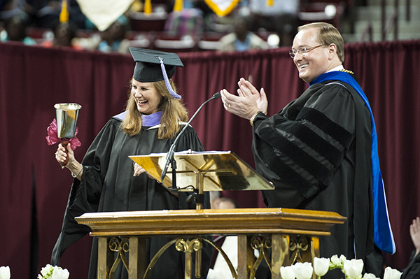 Janet Marie Smith, alumna and internationally recognized architect, rings her new cowbell, a gift from MSU President Mark E. Keenum. Smith presented Mississippi State Universityâs keynote address at the spring 2013 commencement exercises. (photo by Russ Houston)