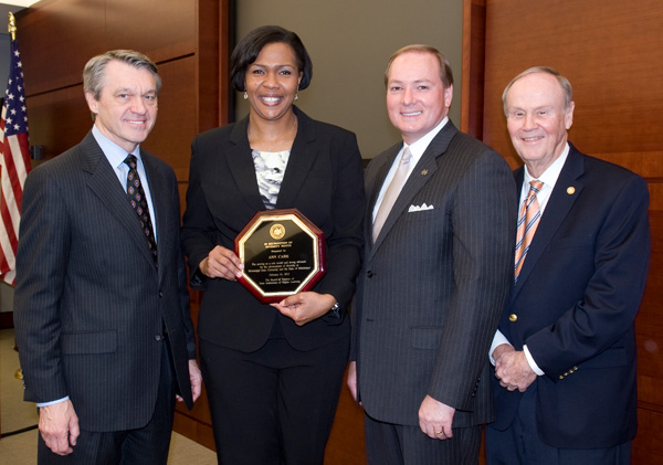 The Mississippi Board of Trustees of the State Institutions of Higher Learning recently held its diversity celebration by recognizing campus and community leaders for their impact on advancing diversity and encouraging understanding and respect. Senior Associate Athletic Director, Student Athlete Services and Senior Woman Administrator Ann Carr, second from left, received the prestigious honor for advancing opportunity and inclusion at Mississippi State University and in the local community. Shown with Carr are, from left, Dr. Doug Rouse of Hattiesburg, recognition committee chair; MSU President Mark E. Keenum; and IHL Board of Trustees President Ed Blakeslee.
