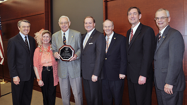 The Mississippi Board of Trustees of the State Institutions of Higher Learning recently held its diversity celebration by recognizing campus and community leaders for their impact on advancing diversity and encouraging understanding and respect. Training Coordinator and Adjunct Professor Emeritus Frank Davis, third from left, received the prestigious faculty honor for advancing opportunity and inclusion at Mississippi State University and in the local community. He is a member of the Department of Biochemistry, Molecular Biology, Entomology and Plant Pathology in MSU's Division of Agriculture, Forestry and Veterinary Medicine. Shown with Davis are, from left, Dr. Doug Rouse of Hattiesburg, recognition committee chair; Carole McReynolds Davis, wife of the honoree; MSU President Mark E. Keenum; IHL Board of Trustees President Ed Blakeslee; Greg Bohach, MSU Vice President of Agriculture, Forestry and Veterinary Medicine; and Jerry Gilbert, MSU Provost and Executive Vice President.