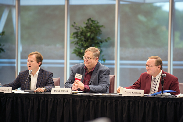 The Mississippi Economic Council, best known as the "state chamber of commerce," held meetings Friday, Oct. 4, in the Hunter Henry Center at Mississippi State University. The MEC board of directors took part in a reception and dinner at the home of MSU President Mark E. Keenum and MSU First Lady Rhonda Keenum on Thursday evening. Shown during the Friday meeting, left to right, was: MEC chairman and MSU alumnus Haley Fisackerly, who is president and CEO of Entergy Mississippi; MEC president and CEO Blake Wilson; and Keenum.