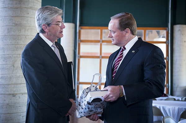 Mississippi State President Mark E. Keenum, right, presents Gov. Phil Bryant a gift. Bryant offered the keynote address at Wednesday's Manufacturing Summit at MSU.