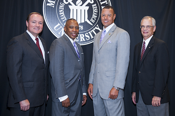 Mississippi State's annual Men of Color Summit featured an opportunity for prominent African-American leaders to gather on campus and learn from each other. From left are Mississippi State President Mark E. Keenum, keynote speaker and author Calvin Mackie, keynote speaker and executive director of the National Society of Black Engineers Carl Mack, and Provost and Executive Vice President Jerome Gilbert discussing their secrets to success.