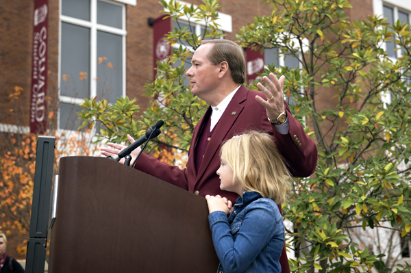 MSU President Mark E. Keenum and his daughter Torie were on hand before the MSU vs. University of Alabama game to help re-dedicate the "Bull Ring," a restored campus landmark dating back to the 1930s. Keenum thanked many people and groups for "stepping forward to bring back the tradition," a D-shaped seating area in front of Colvard Student Union where students meet their friends or catch up on the latest campus news.