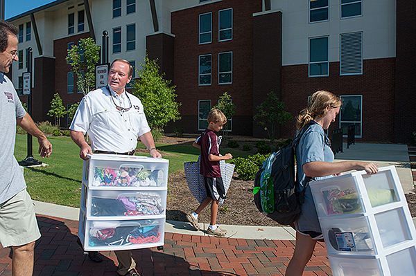 MSU President Mark E. Keenum and his son, Rett, help a freshman as she moves into Magnolia Hall Saturday.