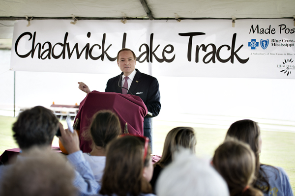 MSU President Mark E. Keenum hosts the Oct. 15 ribbon-cutting ceremony for the new Chadwick Lake Walking and Jogging Trail. The one-mile track will promote healthy habits in the community, as well as the Mississippi State family.