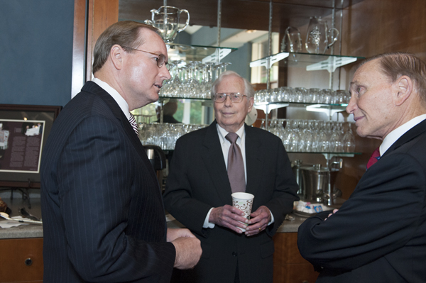 MSU President Mark E. Keenum, left, thanks Riley Foundation Chairman Robert B. Deen Jr., center, and Vice President Marty Davidson for an $11 million grant to fund a new kinesiology program at MSU-Meridian. The program, with an emphasis in clinical exercise and physiology, will be offered in the Downtown Campus Kress Building, which will see major renovations under the funding as well.