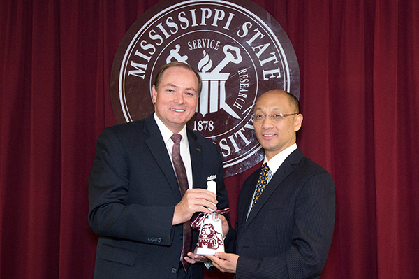 MSU President Mark E. Keenum presents a cowbell to President Lusheng Huang of Jiangxi Agricultural University in Nanchang, China. Huang, who also is a specialist in swine genetics, visited the university Thursday at the invitation of his friend and Jiangxi University graduate, Henry Wan, who is a faculty member with MSU's College of Veterinary Medicine. Along with Keenum, welcoming Huang to the university were Jerry Gilbert, provost and executive vice president; Gregory Bohach, vice president of agriculture, forestry and veterinary medicine; and Kent Hoblet, dean of the College of Veterinary Medicine, among other university leaders who expressed interest in learning more about the parallel interests of MSU and Jiangxi.