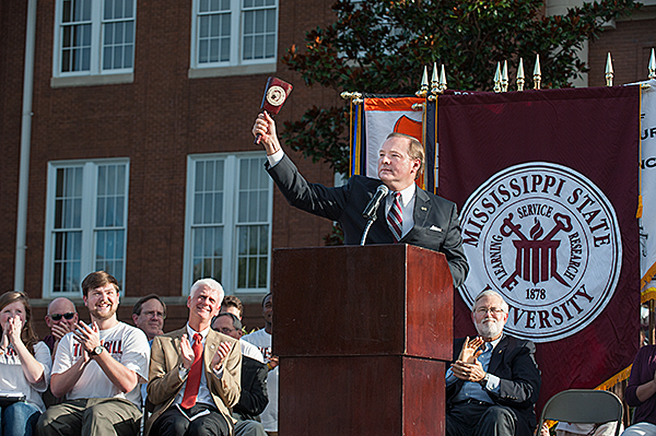 MSU President Mark E. Keenum rings a cowbell during the Drill Monday night. A tradition with roots in the military history of MSU, the Drill is a pep rally held on the historic Drill Field to welcome new and returning students to campus, as well as raise excitement about the upcoming athletic seasons.
