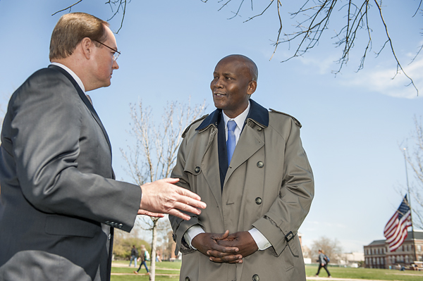 MSU President Mark E. Keenum talks with Kenyan Ambassador Elkanah Odembo prior to a ceremonial tree planting at Mississippi State March 4.