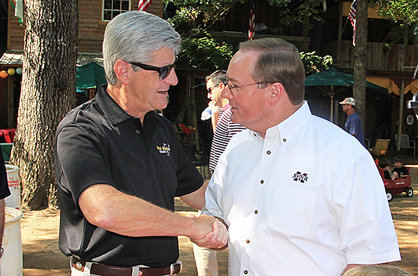 MSU President Mark E. Keenum visited with Gov. Phil Bryant on Founder's Square at the Neshoba County Fair on Thursday. Both Keenum and Bryant spoke under the oaks at the historic campground fair.