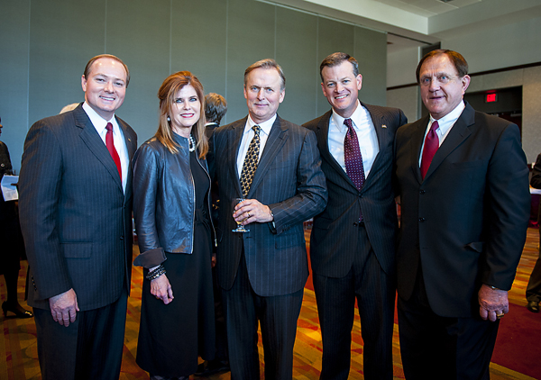 Shown at the reception following the memorial service for the late MSU President Emeritus Donald W. Zacharias were: MSU President Mark E. Keenum, left, Renee Grisham, John Grisham, MSU Athletic Director Scott Stricklin, and former MSU head football coach Jackie Sherrill. (photo by Russ Houston/Mississippi State University)