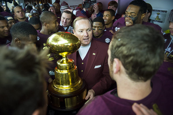 In the wild post-game locker room scene, MSU President Mark E. Keenum congratulates Head Coach Dan Mullen and the MSU Bulldogs on their thrilling 17-10 win over the Ole Miss Rebels in the 2013 Egg Bowl.