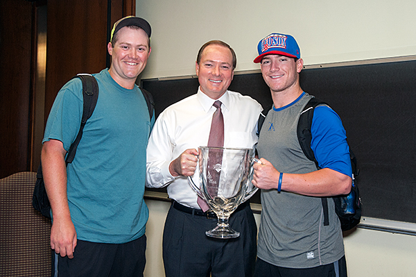 Diamond Dawgs pitcher Trevor Fitts, a junior from Helena, Ala., left, and catcher Gavin Collins, a freshman from Lake Forest, Calif., right, president MSU President Mark E. Keenum with the Governor's Cup Trophy.