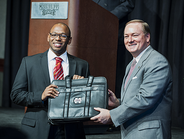 Donald M. "Field" Brown, left, Mississippi State's 2014 Rhodes Scholar, received a briefcase from MSU President Mark E. Keenum at the university's annual Martin Luther King, Jr.