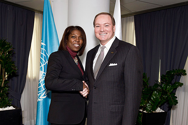 During a five-day mission to Rome with top Mississippi State University academic officers, MSU President Mark E. Keenum, right, met with United Nations World Food Program (WFP) executive director Etharin Cousin, left, and deputy executive director Amir M