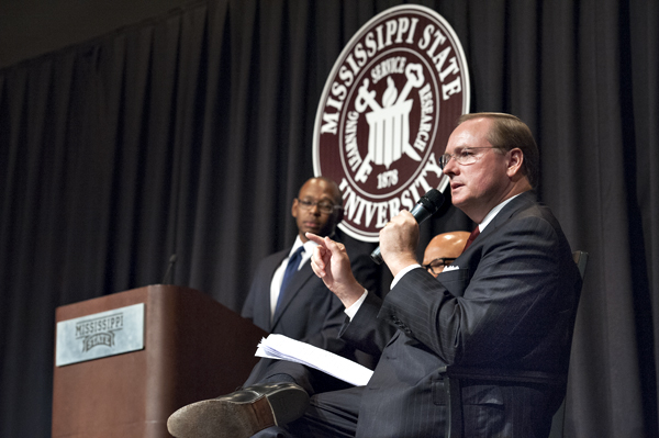 During the "Institutuional Leaders: Building the Path to Success" panel at Mississippi State's Men of Color Summit, MSU President Mark E. Keenum explains the importance of retention, matriculation and graduation for men of color attending institutions of higher learning, as well as all other students. MSU Rhodes Scholar Field Brown, back, moderates the panel, which includes Alcorn State University President Alfred Rankins Jr. and Coahoma Community College President Valmadge T. Towner.