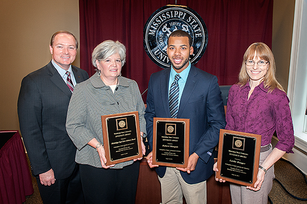 During Mississippi State's 2014 Diversity Awards presentation on Friday, the university honored one group and two individuals promoting diversity both on campus and beyond. From left, MSU President Mark E. Keenum recognized award-winners Safe Zone, represented by Advisory Board member Deborah Jackson; Robert Morgan, a senior education/mathematics major from Vardaman; and Leslie Burger, a forestry extension instructor.