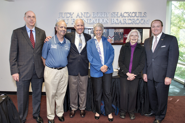 During a Wednesday [Oct. 8] ceremony at Mississippi State Universityâs Hunter Henry Center, family and friends gathered to share memories of alumnus Earl Love Guyton and present scrapbooks he had assembled during and after his time on campus. From left are MSU communication department head John Forde, Earl Loveâs brothers Steve and Sam Guyton; his sister-in-law Jean Guyton; his cousin Polly Brown; and MSU President Mark E. Keenum.