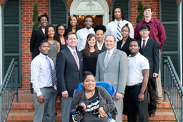 Entergy Mississippi Vice President of Public Affairs John Arledge, front row second from left, spoke to MSU Promise Program students in April at the home of President and Mrs. Mark E. Keenum.
