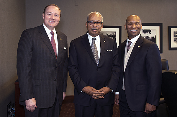 Ernest Green, second from left, was one of the "Little Rock Nine" who first integrated Arkansas public schools in 1957. During his Thursday visit to campus, he met with President Mark E. Keenum, left, and Shane Hooper, right, member of the Institutions of Higher Learning Board of Trustees.