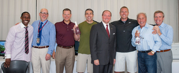 ESPN’s College GameDay crew met with and received cowbells from MSU President Mark E. Keenum, center front, and Athletic Director Scott Stricklin, third from left.